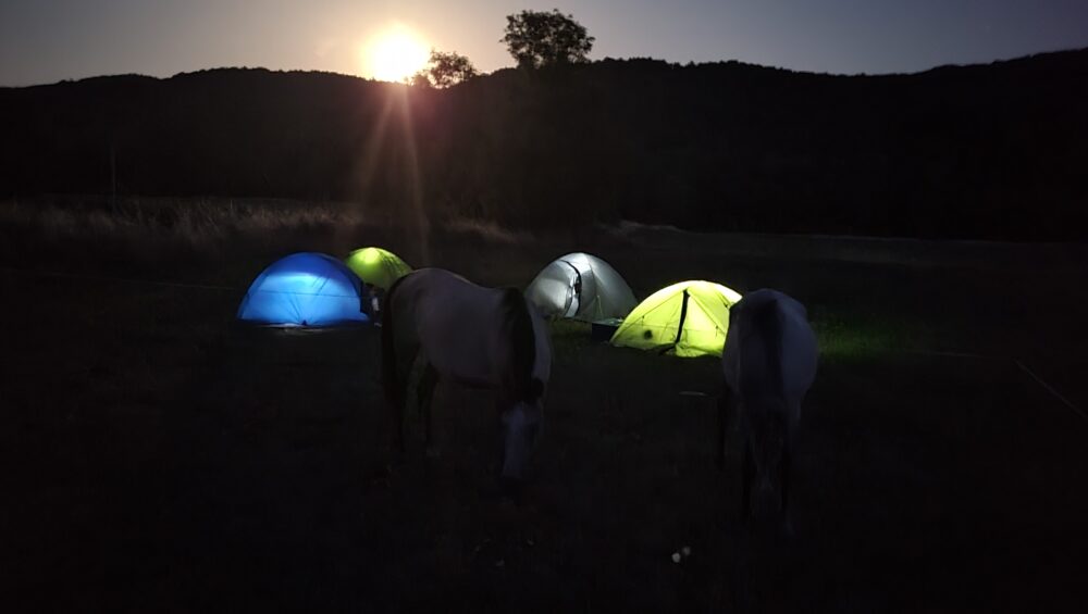 Après s’être exercer aux rôles d’assistants de course quelques fois sur des entraînements faits à domicile, deux bivouacs s’organisent sur l’été. Chaque fois, deux jeunes, deux chevaux, l’éducatrice technique et une éducatrice partent pour une journée et nuit. Rejoint le soir même par Jean-Pierre et Cristina, le dîner s’organise au coeur du campement. Après une petite balade, tout le monde va se coucher pour être en forme le lendemain.